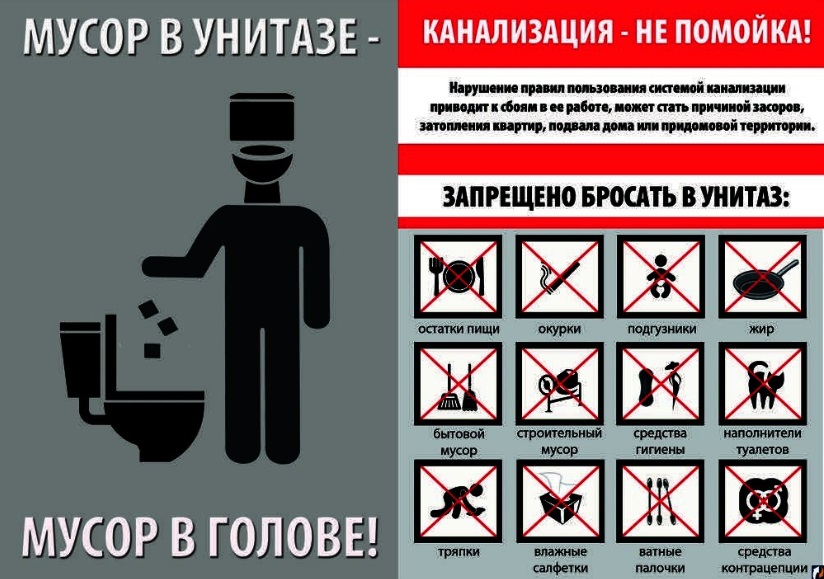 Просим Вас соблюдать правила пользования системой канализации в многоквартирных домах и запрете использования ее в качестве мусоропровода в целях сохранения экологии и комфорта проживания себя и своих соседей.